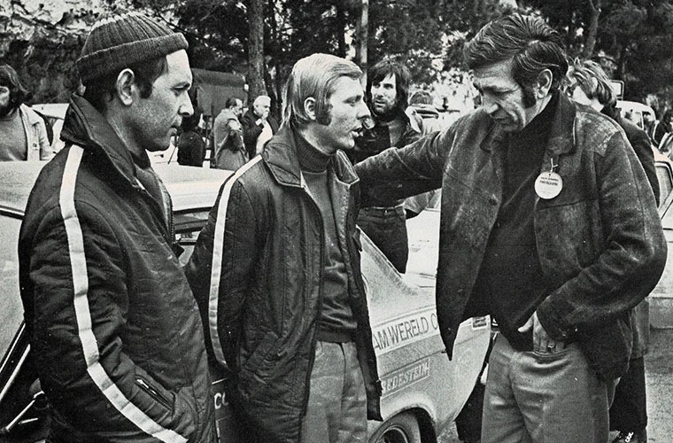 Fred van der Vlugt (r) in gesprek met Gijs van Lennep (m) en Jooks Klein tijdens de Rally Monte Carlo van 1972. De Wereld op Wielen sponsorde dit team met een Ford Escort, die de finish niet haalde.