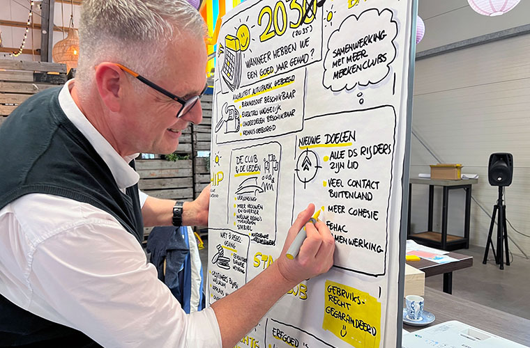 Henk van Trippel H vatte onze inzichten samen in tekeningen. Vervolgens bespraken we in groepen hoe we onze club kunnen verbeteren, vernieuwen of anders kunnen aanpakken. Hiervoor gebruikten we post-its om ideeën te verzamelen. Vooral dit laatste deel vraagt nog verdere uitwerking.