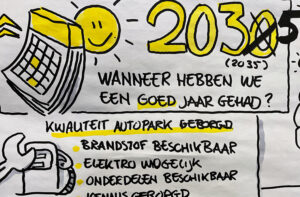 We bekeken zowel de positieve als de minder rooskleurige scenario’s. Er wachten ons ook uitdagingen. Wat als 2035 een geweldig jaar wordt voor onze club? Kunnen we dan nog volop evenementen organiseren onder druk van klimaatverandering? Is er überhaupt brandstof om naar die evenementen te rijden? Is de ID/DS dan nog steeds een geliefde klassieker? Hebben we voldoende technische kennis in huis en onderdelen in ons magazijn? En is er intussen een nieuwe generatie DS-liefhebbers opgestaan en beleeft de ID/DS in 2035 een revival? Of is de DS letterlijk een stilstaand museumstuk geworden onder druk van milieuregels?