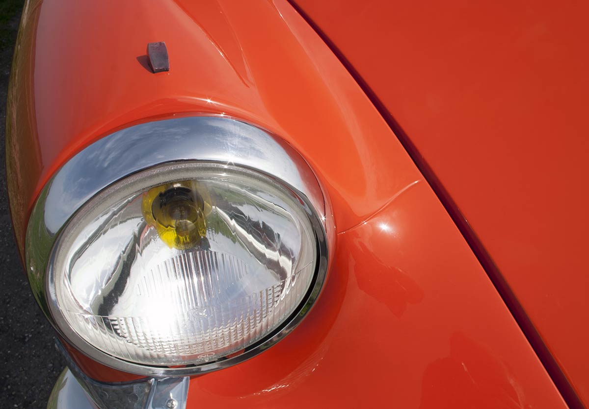 [dropcap size=big]D[/dropcap]it is een verhaal over een autokleur in een tijdperk dat de meeste auto’s nog zwart of minstens donker van kleur zijn. Als het om fotografie gaat, verbind ik deze kleur altijd met het contrastrijke zwart-wittijdperk en nog meer met de aflopende periode van de sobere jaren van wederopbouw in Frankrijk en West-Europa. We schrijven 1957. Je zult maar op het terras zitten van het beroemde existentialistenlokaal Café de Flore in Parijs. Jean-Paul Sartre en Simone de Beauvoir zijn al lang naar huis. Albert Camus heeft zojuist wankelend het café verlaten. Je wacht met je prille liefde op de dageraad in Saint-Germain-de-Prés. Er gloort al een beetje licht, maar nog lang geen zon. En dan, om half vijf ’s morgens, rijdt daar opeens een knaloranje auto voorbij over de Boulevard Saint-Germain. Heb ik dat wel goed gezien? Ben ik bedwelmd door te veel alcohol? Of is dit een droom? Over een speelgoedauto? Die kleur, die is als een duveltje uit een doosje. Capucine!