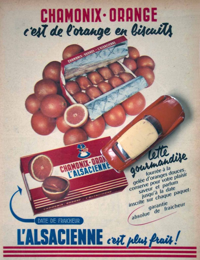 Die kleur Capucine verbind ik ook met de Chamonix-Orange biscuits. Dat zijn koekjes gemaakt door de Franse koekjesfabriek l‘Alsacienne. Ze zijn gevuld met een oranje gelei en die is weer bedekt met oranje glazuur. De biscuits zijn mierzoet en smaken naar sinaasappels. Ze zitten in een doos met twee lagen met daartussen bedrukt zilverpapier. Dit koekje wordt bedacht in de jaren dertig en is geïnspireerd op de Nonette. Dat is een cakeje gemaakt van peperkoek, gevuld met oranje marmelade en honing. Ik zie de doos met die koekjes thuis nog altijd op tafel staan en volgens mij is deze Capucine Dinky Toy nog steeds kleverig van mijn kinderhanden. Dit autootje staat ook nu nog steeds bij mij thuis in de vensterbank, met harde witte rubberen bandjes. Door ouderdom zijn ze uitgedroogd. Chamonix biscuits worden nog steeds gemaakt door de Franse koekjesmaker LU (Lefèvre-Utile) van Danone.