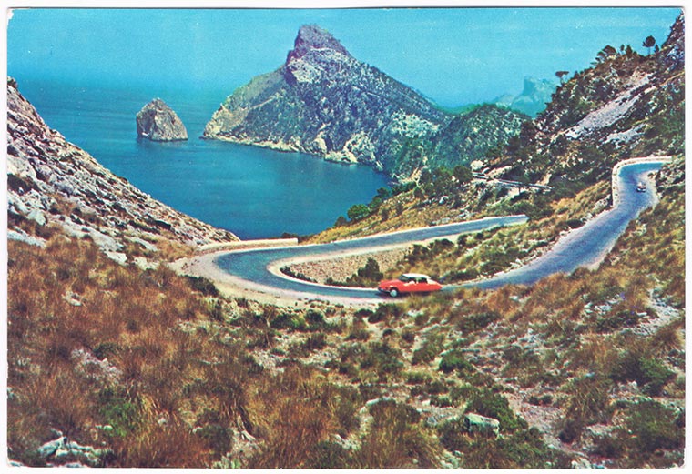 De auto glimt en schittert dat het een lieve lust is en ik moet mijzelf onderdrukken om niet een fijn schuurpapiertje te pakken om hem matter te polijsten, zoals hij in 1958 ook door de fabriekspoort aan de Quai Javel in Parijs gereden is. Maar wat een kleur! Altijd onmiskenbaar in het straatbeeld aanwezig en niet over het hoofd te zien, zoals op de ansichtkaart bij Formentor op het Spaanse Mallorca. Of kijk naar het filmpje hierboven van de Capucine ID19 van Dennis de Rijk, gefilmd tussen Amerongen en Wijk bij Duurstede.