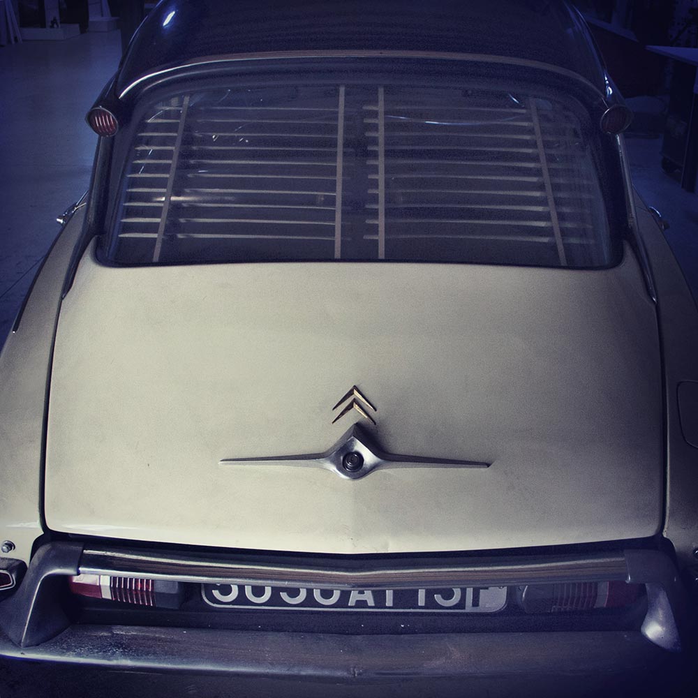 Deze DS19 heeft zeker een museale potentie: een industrieel massaproduct met een prachtig patina van 58 jaar stilstand, behangen met alle denkbare accessoires. Van Robergel naar H.G., ROBRI, een AREL buizenradio, een kledinghaakje van achteruitkijkspiegelfabrikant CIPA tot het losse, originele make-up spiegeltje. De bekleding is nog bedekt met uitgehard beschermend plastic, al is er met ruwe hand een deel van het plastic van de bestuurderstoel afgerukt. Eronder zitten hagelnieuwe zetels bekleed met de stof Bleu Royal. Deze DS straalt geschiedenis uit. Je voelt het als je bij de auto staat; de persoonlijke geschiedenis, de handtekening van de monteurs die de auto geassembleerd hebben. Het lijkt of je zojuist uit een tijdmachine gestapt bent. Alsof je naast Rembrandt staat die met zijn spatel een streek zet op de Nachtwacht. Deze auto maakt al die tot in de perfectie gerestaureerde DS’en tot roestvrije wrakken, tot nietszeggende en zielloze auto’s. Het lijkt wel of deze auto een aura bezit, zoals de Duitse cultuurfilosoof Walter Benjamin (1892 – 1940) dat ooit beschreven heeft. De hand van de schepper van het object wordt tastbaar. Het zwakke licht in Harry’s loods versterkt dit effect alleen maar.