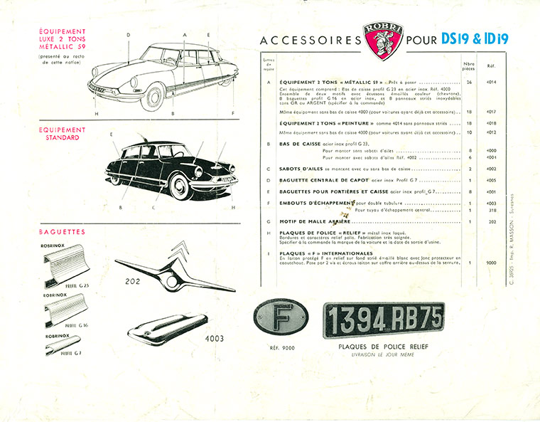 Het personaliseren van je auto is echt niet iets van de laatste jaren. In het tijdperk van de eerste neus van de Citroën DS zijn veel autobezitters op zoek om met behulp van attributen hun auto verder te verfraaien en te voorzien van een eigen identiteit. Met name voor de Franse merken is er in die jaren een ruime keuze aan accessoires. Stripjes in alle soorten en maten, stropdassen, rubberen bumperrozetten, platte uitlaateindstukken en steenslagbeschermingsplaten voor het lakwerk bij voor- en achterschermen, et cetera. De bekendste leverancier is ROBRI, met het ridderharnas als beeldmerk. De fabriek was gevestigd in Puteaux, tegenwoordig een buitenwijk van Parijs. Andere populaire merken zijn Robergel, H.G, Sabolux en Raoul. Deze laatste spant de kroon met een set vinnen voor het achterscherm van de Citroën DS.