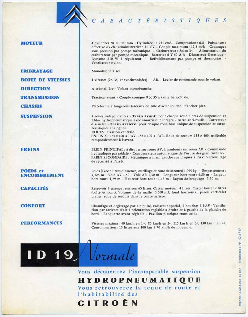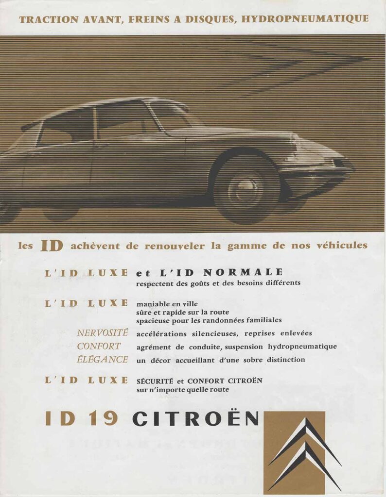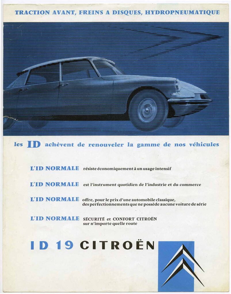 Over de historie van de Citroën ID Normale is weinig bekend. Dat komt niet in de laatste plaats omdat er maar heel weinig publiciteit rond deze auto is geweest. Citroën heeft ook maar een drietal brochures uitgeven waar de Normale in voorkomt. Brochure is in dit geval een groot woord. Het zijn niet meer dan sobere velletjes met alleen basale informatie, met soms tegenstrijdige informatie. Dan ligt het reservewiel in de kofferbak, dan weer onder de motorkap. Citroën geeft veel meer publiciteit aan de ID19 Luxe en Confort. Dat zijn de modellen die het alternatief moeten zijn voor de veel gecompliceerde DS19.
