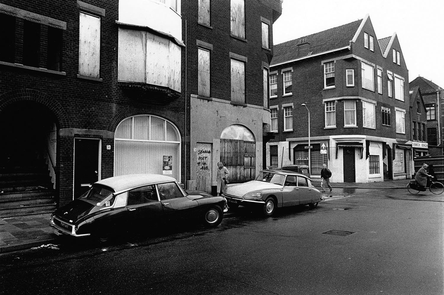 Een straatbeeld van de Stationsbuurt in Den Haag, gemaakt in 1984 door een onbekende fotograaf. Of eigenlijk is het meer een tijdsbeeld. Een oud vrouwtje met een sjaaltje over haar hoofd en een grote handtas passeert een slooppand. Op de dichtgetimmerde deur staat geschreven dat de postbode de brieven voor Spinoza in de bus van nr. 40 moet gooien. Ook de ramen van het huis ernaast zijn dicht gemaakt. Rechts op de foto fietst een andere vrouw gehaast met open jas uit beeld. Een man met een kort jack steekt de straat over. Links is er een duister portaal met een trap naar de ingang van de bovenwoningen. Er ligt afval op de trap. Het zijn onbewoonbaar verklaarde woningen.