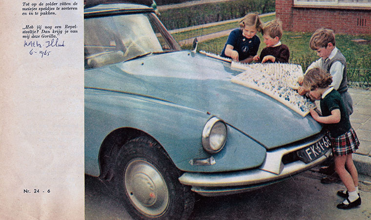 De bijgevoegde foto komt uit de editie van juni 1965. We zien (als ik goed gekeken heb) een DS19. Een eerste neus zonder asbakken, in de kleur Bleu Monte Carlo. De auto ziet er wat shabby uit. De nummerplaat is gedeukt, de kleur wat dof en vader of moeder heeft iets te scherp ingeparkeerd kijkend naar de krans van beschadiging op de wieldop. De bijgevoegde tekst is gewijd aan het verzamelen van allerlei kleinigheden, in dit geval reclamespeldjes. Een bezigheid die in de jaren vijftig en zestig populair was bij de jeugd en de Katholieke goedkeuring kon wegdragen. De DS19 op deze foto is een echt gebruiksvoorwerp en heeft nog niet de sacrale status die wij haar toedichten. Lekker scherpe speldjes uitwisselen op de motorkap van papa’s auto, een paar krasjes in de lak doen er niet toe.