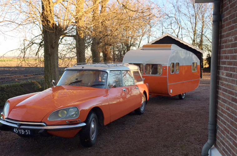 [dropcap size=big]E[/dropcap]en leuk idee de kleur van de DS. Mijn Break is van 1973 toen we klaar waren met de restauratie hebben we gekozen voor AC303 (Capucine) en AC136 (Gris Rosé); we wilden ook graag een echte opvallende jaren 60 retrokleur, omdat we allebei ook echt iets met die tijd hebben (beide geboren in 1956). Het mooie is dat deze kleur van 1957 is en het roept wel vragen op bij veel mensen. De een zegt oh, wat mooi! En er zijn er die het het spuuglelijk vinden. Maar zelf vinden we de combinatie met onze oude KEMA-caravan prachtig en uiteindelijk doe je het voor jezelf en beleven er al een aantal jaren heel veel plezier aan.