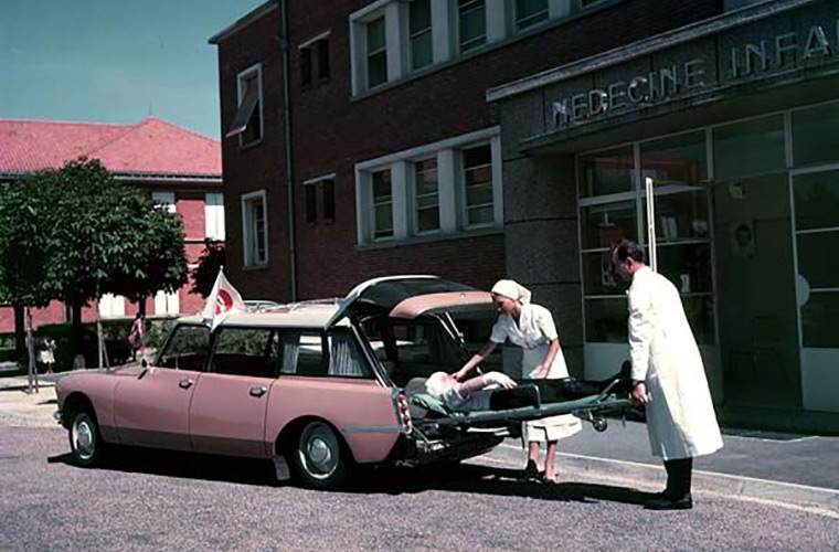 [dropcap size=big]W[/dropcap]it (bijvoorbeeld Blanc Meije AC088) is niet de enige kleur waarin de DS als nieuwe ziekenwagen rondreed: dat varieerde bij de eerste en tweede neuzen van Bleu Pacifique (AC607) en geelgrijs Gris Sable (AC104) tot het bonte beigebruin (AC306 Ecaille Blonde in de kleurenfilm ‘Hibernatus’ van Louis de Funès). Tot en met de tweede neus mochten de (particuliere) ambulances geen blauw knipper- of zwaailicht voeren. Dat laatste was voorbehouden aan overheidsdiensten brandweer en politie. En omdat de overheid zich toen nog niet met de ziekenbroeders bemoeide waren er dus ook nog geen wettelijke eisen aan de kleur van de ziekenwagen.
