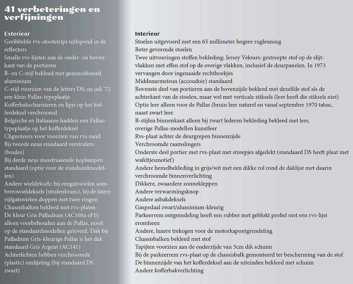 De afgelopen jaren zijn in Nederland veel DS’en en zelfs ID’s omgebouwd tot een Pallas. Versleten interieurs worden weggegooid en vervangen door de luxere Pallas-zetels. Heel vaak worden deze om­bouwacties maar voor de helft of nog minder uit­gevoerd. Ik heb in ieder geval nooit een complete verpallassing gezien. Mensen vergeten vaak dat er een compleet andere hemel en binnenverlichting in moet; de trekogen van de motorkapontgrende­ling is het meest vergeten onderdeel van de niet-originele Pallas. Het aantal nog in Nederland rond rijdende Pallassen is dan ook geen afspiegeling van de verkoopcijfers van destijds. Het aandeel verkochte Citroëns DS Pallas ten opzichte van de totale productie schommelt rond de dertig procent van de verkopen. Overigens is een DS Pallas niet herkenbaar aan het chassisnummer.Al die buitenissigheden hebben natuurlijk ook een keerzijde. Om alle (rvs-)strippen en stripjes aan de carrosserie van een DS Pallas te bevestigen worden er talloze gaten en gaatjes geboord in de carros­serie. De Citroën DS die toch al roestgevoelig is, gaat er mogelijk nóg harder van roesten. De stoot­strips boven de deurbakken van een Pallas hebben ook geen functie. Hij oogt daarmee een beetje als een botsauto op de kermis. Als de auto eenmaal in de laagste stand staat op een parkeerplaats, kun je met het portier van de Volvo van de buurman een flinke deuk maken in de zijkant van de Citroën. Want de deur van de buurman gaat namelijk over de strip heen. Dan is er nog het beruchte Pallas-schuim aan de binnenkant van de kofferklep, die na een aantal jaren gebruik permanent hele em­mers water vasthoudt. En is het vocht langs een andere weg eenmaal in de cabine doorgedrongen, dan zorgt het vijf centimeter dikke schuim onder de matten ervoor dat alles gegarandeerd nat blijft.Maar hoe dan ook, de DS Pallas blijft het topmo­del van de D-serie en kent een grote schare lief­hebbers. La pallas, du luxe et du bon goût, zeggen de Fransen.