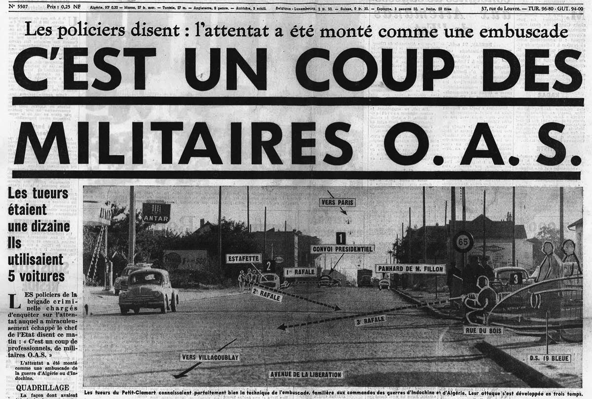 Op 22 augustus 1962, rond half acht ‘s avonds verlaten twee Citroëns DS19 het Elysée om president Charles de Gaulle naar de luchtmachtbasis van Villacoublay te brengen, vlak onder Parijs. De zwarte regeringsauto’s worden geëscorteerd door twee motoren. Daarna zal De Gaulle naar Saint-Dizier vliegen. Dat is niet ver van zijn buitenverblijf ‘La Boisserie’ in Colombey-les-Deux-Églises. Dat ligt in Noord-Oost Frankrijk, in de regio Champagne-Ardennes.