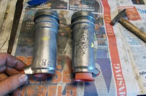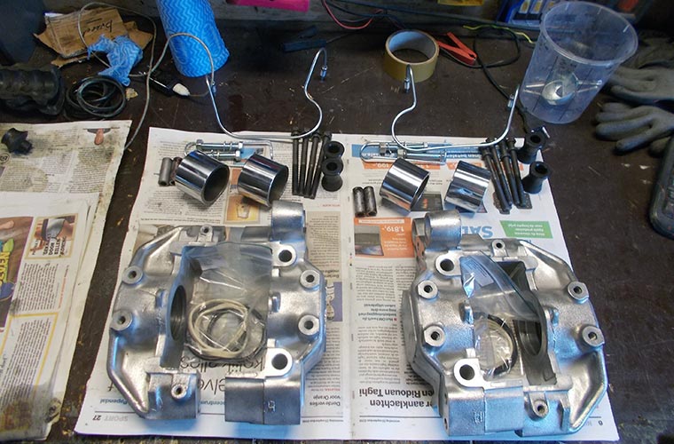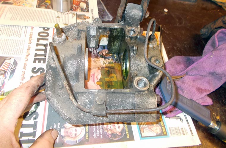 De remklauwen zijn ondanks de lange stilstand niet zwaar geoxideerd, mogelijk door het aangekoekte vet en oude LHM-olie. De twee aanwezige zuigers kunnen behoorlijk vastzitten. Perslucht is de oplossing voor de tegenstribbelende kandidaten. Door de hoge druk wordt de zuiger naar buiten gedrukt, in veel gevallen moet een aantal keren de zuiger heen en weer worden geschoven. Zorg wel dat je de zuiger bij het loskomen kan opvangen in een doek. Bij een van mijn allereerste pogingen werd de zuiger als een kanonskogel gelanceerd tegen de muur. De bijbehorende knal maakte het schrikeffect compleet en ik was weer een ervaring rijker. Het is wederom een kwestie van ontvetten, stralen en zorgen dat alles er weer netjes uit komt te zien.