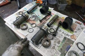 Met een nieuwe afdichting set, die bestaat uit een teflonring, viltring en rubber o-ring, kan het geheel wederom worden gemonteerd. Controleer ook de conditie van de veercilinderstang, met name het bolgewricht kan aangevreten zijn. Samen met een nieuwe lekzak en gereviseerde deelbare veerbol hebben we wederom een mooie set gereed voor montage.