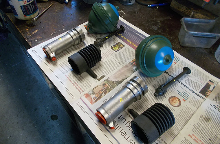 Zuigers zijn eventueel nieuw te verkrijgen, maar bij minimale beschadigingen is polijsten een goede optie. Breng voldoende LHM-olie aan bij het monteren van de afdichtingset, die bestaat uit twee rubber o-ringen en twee viltringen. De remklauw kan worden afgemonteerd met nieuwe of bestaande metalen hydraulische leidingen, de combinatie met de net gepassiveerde klemmen geeft een mooi eindresultaat. Een nieuw setje remblokken maakt het geheel af en klaar voor montage. De remcilinders bij de achterbrug waren al reeds vervangen bij de revisie van de achterste draagarmen. Dit hebben jullie al kunnen lezen in een vorige aflevering.