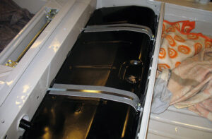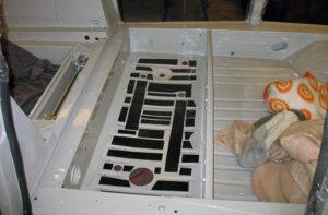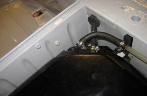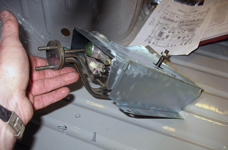 De onderzijde van het compartiment wordt voorzien van anti-dreunplaat. Met een aparte draaibeweging komt de brandstoftank op zijn plaats te liggen. De vulpijp en ontluchtingsleiding worden tevens afgemonteerd. De nylon brandstofleiding wordt met wat vaseline door de metalen geleidingsbuis, die is aangebracht in de tank, geduwd. Vergeet vooral niet de onderzijde van de nylon leiding schuin af te snijden, dit voorkomt dat de leiding tot op de bodem van het benzinefilter wordt gestoken. Op deze wijze blijft altijd de aanvoer van benzine houden.