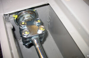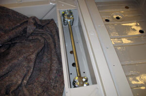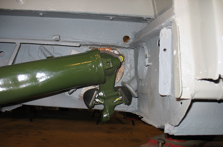 We starten met de draagarm aan de rechter achterzijde. Zorg er altijd voor dat eventuele lak en/of epoxyverf is verwijderd bij het asgat. De draagarm zelf is behoorlijk zwaar en het vergt wat spierkracht om alles op zijn plek te krijgen. Alle tapeinden worden ingesmeerd met kopervet, zodat ook in de toekomst alles op een fatsoenlijke wijze kan worden gedemonteerd.