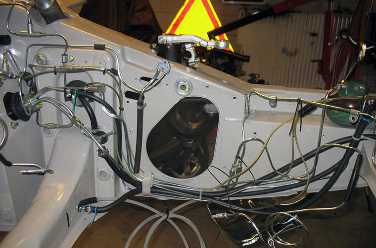 De aanwezigheid van hoogteregelaars, veercilinders, veerbollen, lekzakken, halve voorbruggen en achterbrug functioneren nog niet zonder de aanwezigheid van hydraulische- en retourleidingen. We starten met het aanbrengen van de leidingen aan de achterzijde, een geduldige maar dankbare klus.