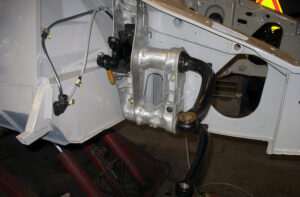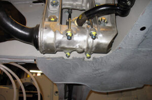 Aangezien de onderdelen nagenoeg allemaal gereviseerd zijn, verloopt de montage van de beide draagarmen vlot. De stabilisatorstang aan de achterzijde verbindt de beide achterste draagarmen met elkaar. Nadat de moeren zijn nagetrokken met het juiste koppel is het achterste gedeelte gereed. De dame is voorzien van haar eerste onderdelen en dat geeft een goed gevoel. De linker voorbrug wordt als eerste gemonteerd, het wiellagerblok wordt op een later tijdstip gemonteerd. Zorg ook hier dat eventuele lak en/of epoxyverf wordt verwijderd van tapeinden van het chassis. Aangezien de brandstof- en retourleiding de rechter halve voorbrug passeert, monteren we eerst de brandstoftank.