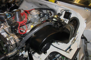 De originele isolatie achter en onder het dashboard, wordt zo goed mogelijk nagemaakt van nieuw isolatiemateriaal. De zwart gelakte en gereviseerde linker en rechter ventilatieroosters maken het dashboard af.