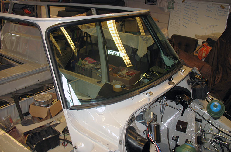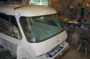 De ruiten worden vervangen door getinte exemplaren en allemaal voorzien van nieuwe zwarte raamrubbers. De voorruit wordt als eerste geplaatst en deze geeft het chassis al wat meer smoelwerk. Inmiddels is ook de bekleding gearriveerd, stoelen, banken en deurpanelen. Dit allemaal in cognackleurig leder, met de typische, heerlijke en authentieke geur van dit natuurproduct. Deze geur ontstaat door de gebruikte looistoffen en aanwezige vetten. Maar de bekleding verdwijnt vooralsnog naar zolder, er zijn eerst nog andere klussen uit te voeren.
