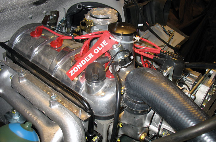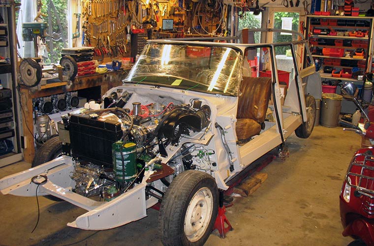 Na het toedienen van de benodigde levenssappen (olie, benzine, LHM en koelvloeistof) is het zover. De wagen kan gestart worden. Aangezien er nog geen dashboard aanwezig is, heb ik een kleine omleiding van 12 volt gemaakt naar de bobine. Een klein beetje benzine in de carburateur en de startmotor wordt aan geslingerd via het startrelais. Bij de tweede poging heeft de benzinepomp voldoende benzine opgepompt en het DY3-motorblok slaat aan. Er wordt voldoende oliedruk opgebouwd en we laten het motorblok rustig warm lopen. Aangezien de uitlaat nog niet is gemonteerd zitten we in elk geval boven het toegestane aantal decibellen. Gelukkig staat de wagen in de garage en niet op de openbare weg.
