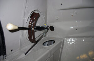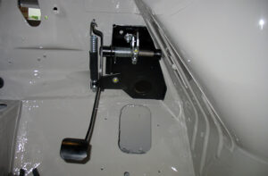 Aan de bestuurderszijde worden alle onderdelen gemonteerd voor de bediening en besturing. Denk hierbij aan gaspedaal, handrem, schakelhuis, remcommando en koppelingspedaal. De achterste kabelboom is inmiddels ook aangebracht en in combinatie met de voorste kabelboom en het gereviseerde zekeringskastje is het al een behoorlijk elektrisch netwerk geworden.
