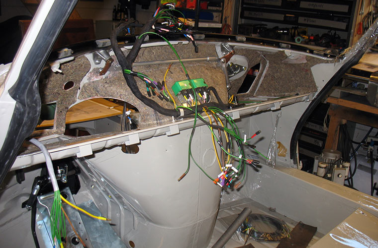 Alle bestaande kabelbomen worden vervangen door een nieuw exemplaar. Met name de kabelboom achter het dashboard verkeerde in slechte conditie. Vanaf 1969 hebben vorige eigenaren hun best gedaan om veel autoaccessoires aan te sluiten. De bekende blauwe snijverbinders waren dan ook ruimschoots aanwezig om aftakkingen te maken.