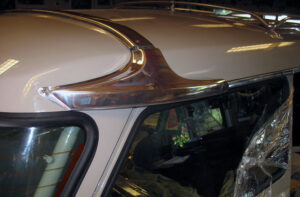 Het metalen dak, voorzien van een nieuwe laklaag, wordt aan de binnenzijde voorzien van een nieuwe hemelbekleding. Dit metalen dak – inclusief de imperiaal – vormt overigens een dragend deel van de kapconstructie. De gepolijste sierstrippen, aan de rand van het dak, maken het geheel af. De achterklep was al reeds gespoten en wordt voorzien van een nieuwe achterruit, een klusje waar de kramp in de vingers zeker kan toeslaan. Deze tweedelige achterklep is eerder gesignaleerd bij de Simca Marly, de onderste klep kan gewoon open blijven bij het vervoer van lange voorwerpen. Door deze extra functie wordt meteen de aanwezigheid van de tweede kentekenplaat duidelijk, ook met een geopende onderste klep blijft er altijd een nummerplaat zichtbaar.