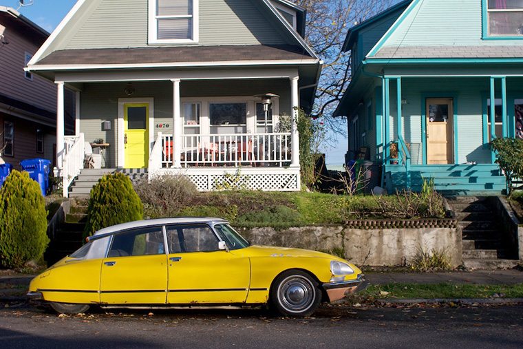 Deze Citroën DSpécial uit 1970 heeft misschien net even teveel water gehad tijdens die zachte vochtige winters. Ooit is de auto kanariegeel gespoten (evenals de voordeur van het huis) en zijn de lichtbakken zilverkleurig gemaakt, waarschijnlijk geïnspireerd door de film Back to the Future (1985) van Steven Spielberg. Die nieuwe laklaag heeft niet geholpen. De roest toont zich opnieuw aan de onderkant van de portieren. De bodem zal vast ook wel aan restauratie toe zijn. De deuren zijn er ook later ingezet, want het model dateert van 1970. De portieren met de GS-klinken zijn van na 1972. Zo te zien wordt de DS niet meer dagelijks gebruikt. De auto is op het moment van de foto 40 jaar oud.